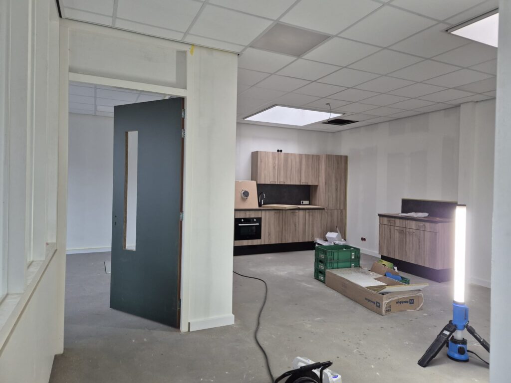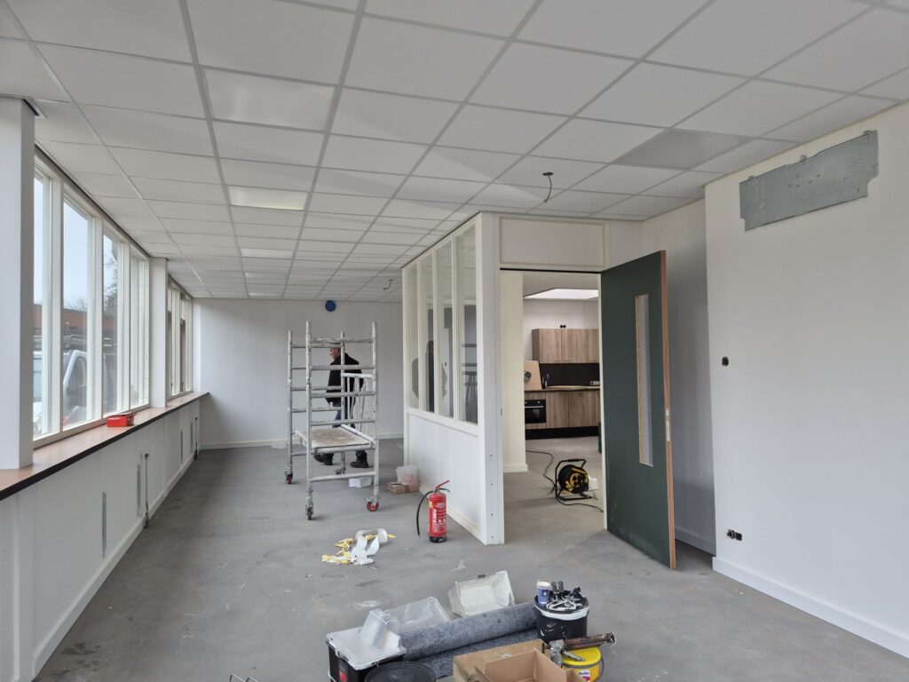 De renovatie omvat onder meer het realiseren van nieuwe wanden, het vervangen van kozijnen en beglazing en het volledig vernieuwen van de vloeren. Hiermee ontstaat een moderne en functionele werkomgeving waarin de technische dienst kan beschikken over nieuwe, eigentijdse kantoren.